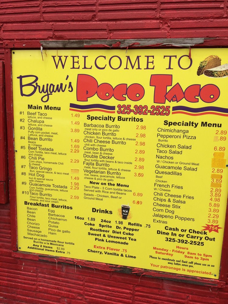 Introducing "Bryan's Poco Taco," a delightful destination for breakfast and brunch enthusiasts craving authentic Mexican flavors. Located at 515 11th St, Ozona, TX, this eatery is your go-to stop for fresh, delicious dishes that satisfy every palate. Their main menu boasts classics like Beef Tacos, Chalupas, and Bean Burritos, all starting at just $3.19. Customers rave about the unparalleled freshness of ingredients, with standout items such as the Bacon, Egg, and Cheese Burrito and the tantalizing Chili Pie.